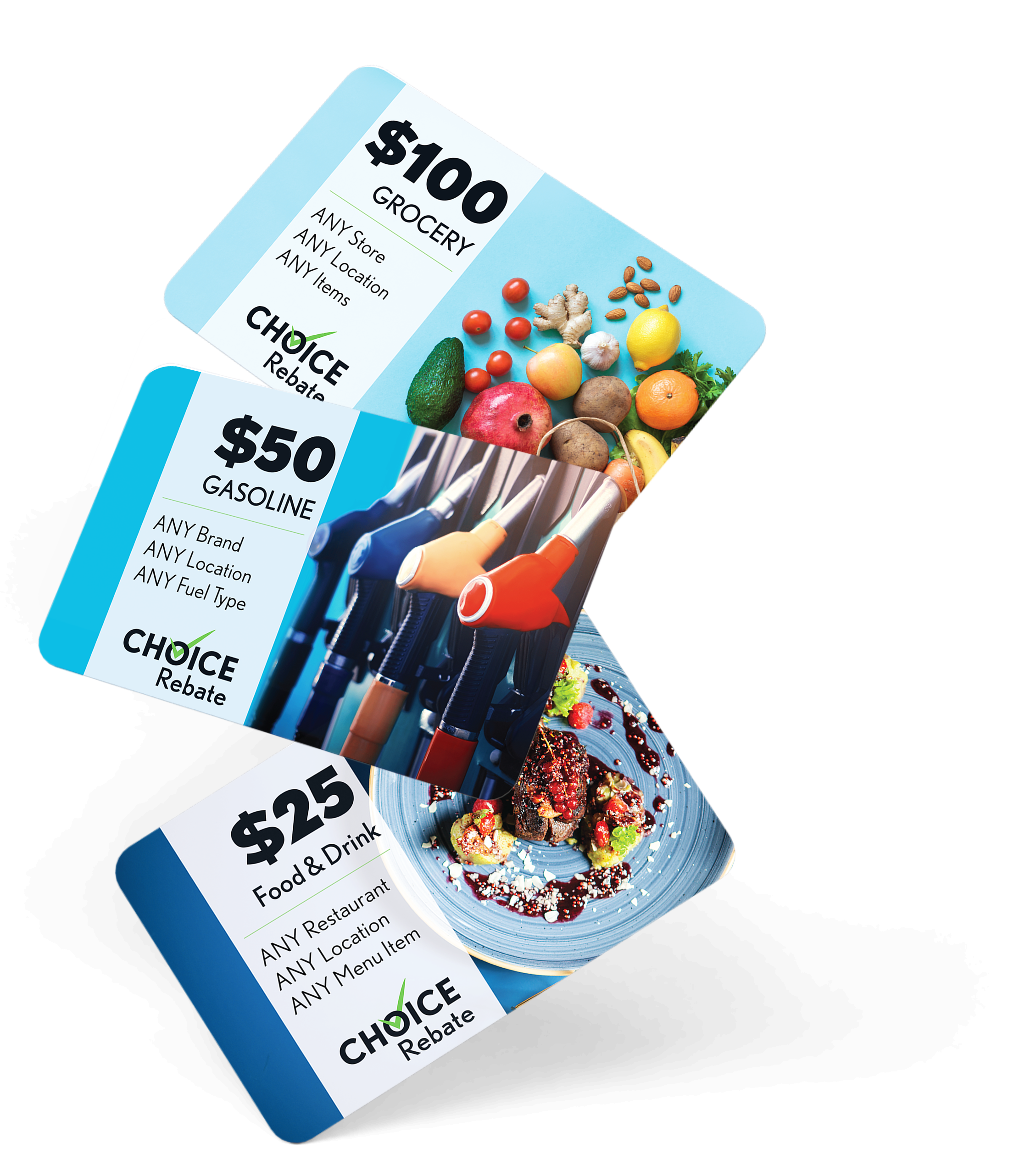 Give customers the choice with all 6 popular categories featured on your reward. CHOICE Rebates can be redeemed from ANY merchant, location, and purchase within any of the 6 categories. Customers will receive cash for their purchase receipts up to the value of the reward.